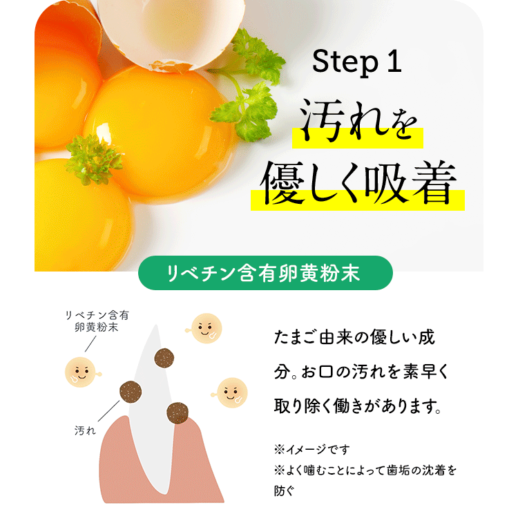 | リベチン含有卵黄粉末 | ・お口の汚れをすばやく取り除く ・汚れを優しく吸着 ※1 |