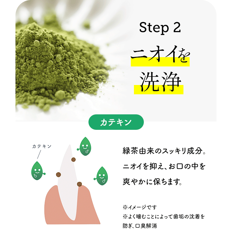 | カテキン | ・ニオイを抑えお口の中を清潔に爽やかに保つ ※1 |