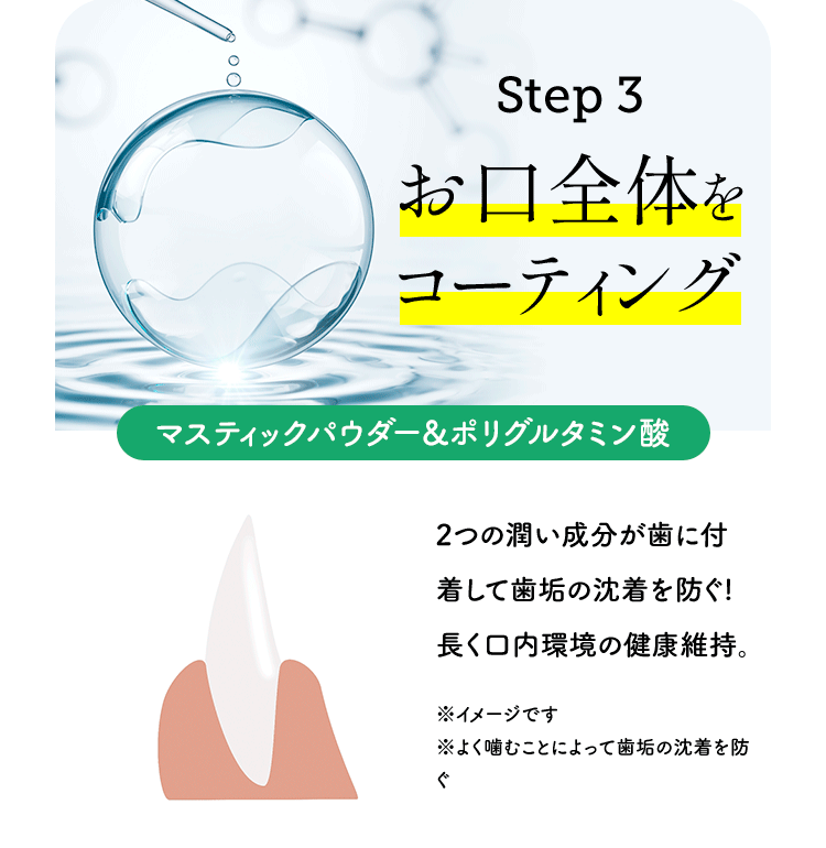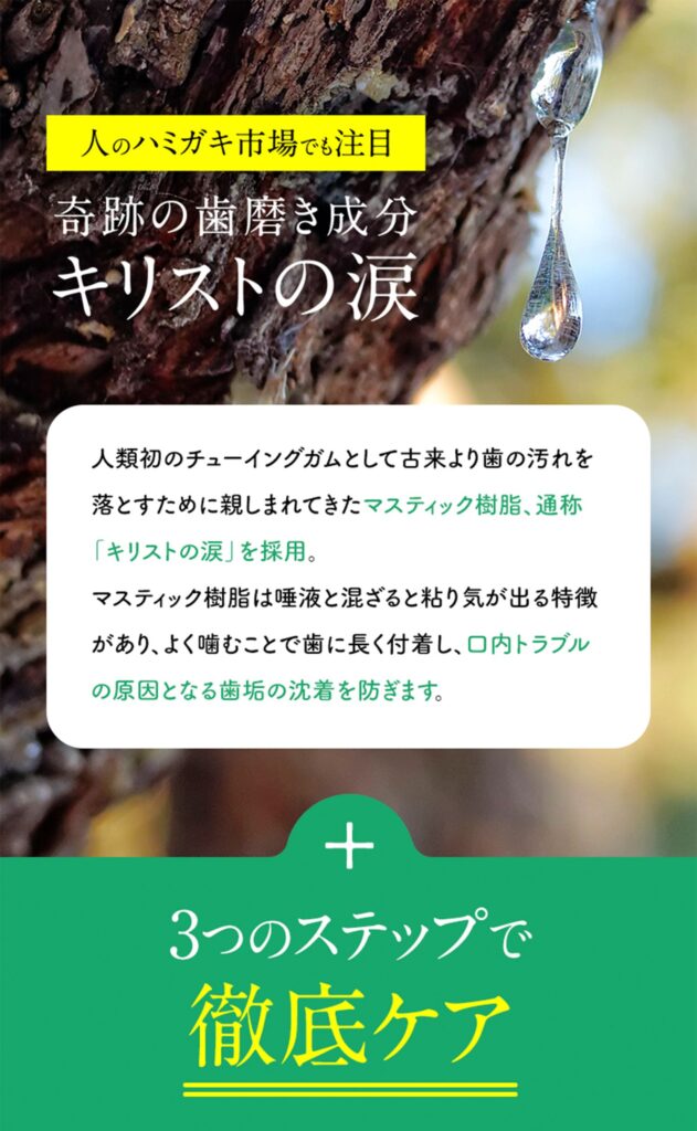 | マステイック樹脂 | ・粘り気がでる特徴があり、よく噛むことで長く付着し、歯垢の沈着を防ぐ ・ネバネバ歯垢を落とす ・ネバネバが口臭の原因である歯垢を落とす ※1 |